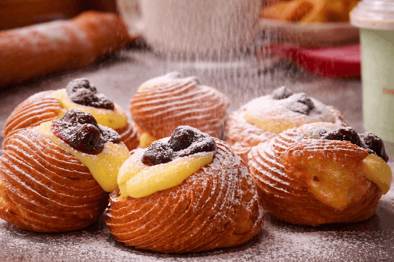 Pasticciotti, zeppole e assortimento di Brioches sfornate nel nostro laboratorio.
